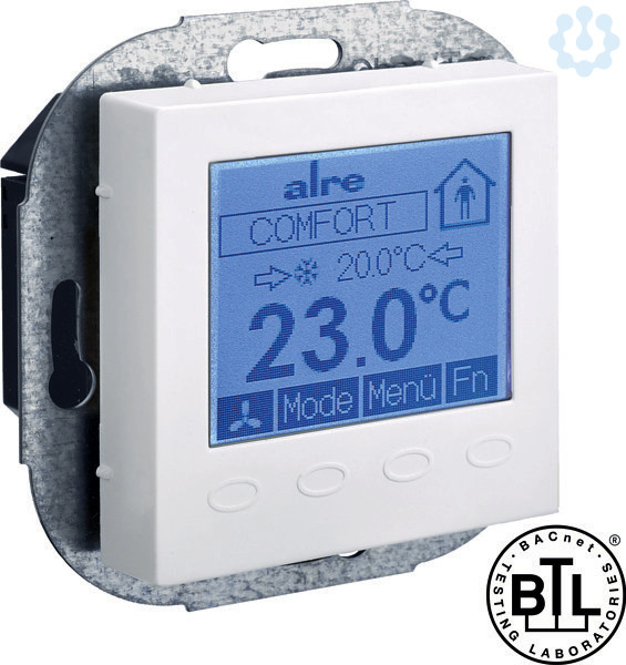 Der alre BACnet Einzelraumregler mit grafischem Display wurde speziell für den zeitabhängigen Heiz- und Kühlbetrieb in 2- oder 4-Rohr-Systemen entwickelt. Der Regler kann in vielfältigen Bereichen eingesetzt und angewendet werden, wie zum Beispiel im Hotel, Wohn-, Büro- und Geschäftsräumen sowie Krankenhäuser und Schulen. Das Gerät besitzt zwei Ein- und drei Ausgänge. Zwei der Ausgänge schalten Relais, die jeweils bis zu 5 Stellantriebe ansprechen können. Der dritte Ausgang ist analog ausgeführt (0-10 V) und kann z. B. für die EC-Lüftersteuerung verwendet werden. Einer der beiden Eingänge dient zur BACnet-Kommunikation, der andere ist konfigurierbar für den Anschluss von Sensoren z. B. für Temperatur oder Taupunkt. Über BACnet können Fenster oder Präsenzkontakte verbunden werden.