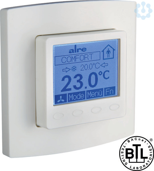 Der alre BACnet Einzelraumregler mit grafischem Display wurde speziell für den zeitabhängigen Heiz- und Kühlbetrieb in 2- oder 4-Rohr-Systemen entwickelt. Der Regler kann in vielfältigen Bereichen eingesetzt und angewendet werden, wie zum Beispiel im Hotel, Wohn-, Büro- und Geschäftsräumen sowie Krankenhäuser und Schulen. Das Gerät besitzt zwei Ein- und drei Ausgänge. Zwei der Ausgänge schalten Relais, die jeweils bis zu 5 Stellantriebe ansprechen können. Der dritte Ausgang ist analog ausgeführt (0-10 V) und kann z. B. für die EC-Lüftersteuerung verwendet werden. Einer der beiden Eingänge dient zur BACnet-Kommunikation, der andere ist konfigurierbar für den Anschluss von Sensoren z. B. für Temperatur oder Taupunkt. Über BACnet können Fenster oder Präsenzkontakte verbunden werden.
