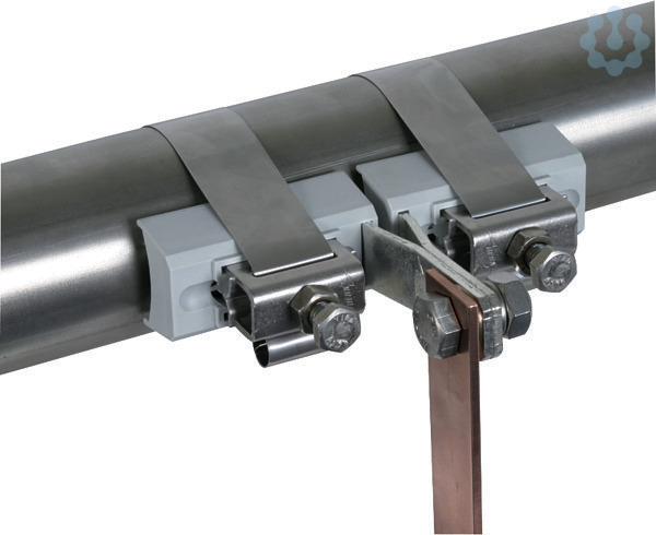Bandrohrschelle für Ex-Bereiche, zur elektrischen Kontaktierung von Rohren im Ex-Bereich, zur Umsetzung des Blitzschutz-Potentialausgleichs nach DIN EN 62305-3 (VDE 0185-305-3). Für den Einsatz in den explosionsgefährdeten Bereichen Ex-Zonen 1 und 2 (Gase, Dämpfe, Nebel) sowie Ex-Zonen 21 und 22 (Stäube). Geprüft nach der Explosionsgruppe IIB und nach DIN EN 62561-1. Erhebliche Einsparung von Montagezeit ? Außerbetriebsetzen der Anlage / Bereiche bedingt durch Schweiß- oder Bohrarbeiten ist nicht mehr notwendig. Ausführung Typ EX BRS 300, für den Klemmbereich D89-300 mm.