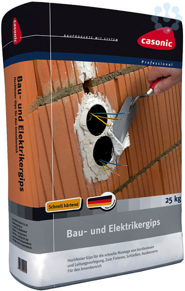 Bau- und Elektrikergips, zum Einsetzen von Steckdosen, Füllen von Löchern, für Ausbesserungs- und Installationsarbeiten, Dübeln, Glätten und Fixieren im Innenbereich. Speziell abgestimmt für Bau- und Elektrikerarbeiten. Auch für Form- und Modellierarbeiten bestens geeignet, Verarbeitungszeit ca. 15-20 Minuten, Mischungsverhältnis ca. 8 l Wasser / 10kg, Lagerfähigkeit ca. 3 Monate, im Papiersack 5 kg