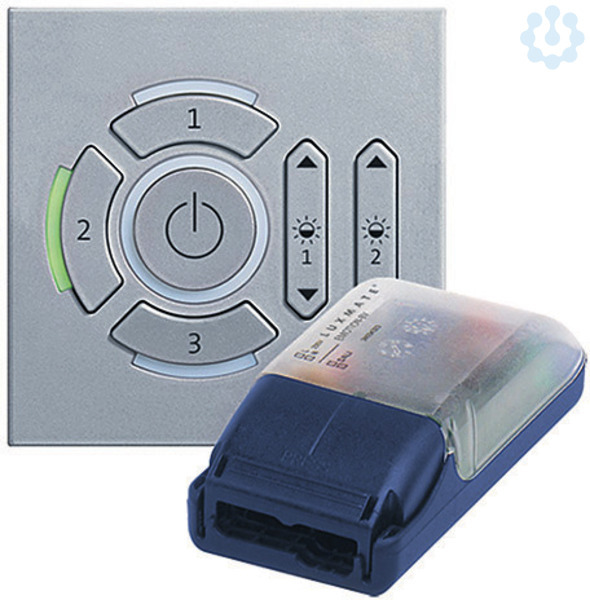 Paket: Bediengerät silber, Busversorgung, Flexible und kostengünstige Szenen Lichtsteuerung, zur Ansteuerung von bis zu 64 DALI-kompatiblen Betriebsgeräten. Paket besteht aus Bediengerät und Spannungsversorgung. Bediengerät: mit kreisförmig ausgerichteten Tasten zum Aufruf von drei Lichtszenarien. Zentrale, beleuchtete Kommen/Gehen-Taste und zwei Tasterwippen, welchen zwei Leuchtengruppen zugeordnet sind. Gehäuse und Tasten bestehen aus Kunststoff silber, Oberfläche seidenmatt, Abmessungen: 87 x 87 x 13 mm. Einfache Montage in bauseitige 1-fach Dose. Versorgung über DALI-Steuerleitung (kein Netzanschluss), Strom-Aufnahme 6mA (3 DALI-Lasten). Spannungsversorgung: für bis zu 64 Teilnehmer bzw. 100 DALI-Lasten (max.200mA). Kurzschluss- und spannungsfest gegen 230/240V Fremdspannung. Aus flammwidrigem Polycarbonat, halogenfrei. Montage in Kabelkanälen oder Deckeneinwurf, zulässige Umgebungstemperatur: 0°C bis +50°C. Schutzart IP20, Abmessungen: 101,5 x 29,5mm.