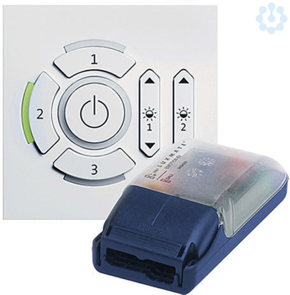 Paket: Bediengerät weiß, Busversorgung, Flexible und kostengünstige Szenen Lichtsteuerung, zur Ansteuerung von bis zu 64 DALI-kompatiblen Betriebsgeräten. Paket besteht aus Bediengerät und Spannungsversorgung. Bediengerät: mit kreisförmig ausgerichteten Tasten zum Aufruf von drei Lichtszenarien. Zentrale, beleuchtete Kommen/Gehen-Taste und zwei Tasterwippen, welchen zwei Leuchtengruppen zugeordnet sind. Gehäuse und Tasten bestehen aus Kunststoff weiß, Oberfläche seidenmatt, Abmessungen: 87 x 87 x 13 mm. Einfache Montage in bauseitige 1-fach Dose. Versorgung über DALI-Steuerleitung (kein Netzanschluss), Strom-Aufnahme 6mA (3 DALI-Lasten). Spannungsversorgung: für bis zu 64 Teilnehmer bzw. 100 DALI-Lasten (max.200mA). Kurzschluss- und spannungsfest gegen 230/240V Fremdspannung. Aus flammwidrigem Polycarbonat, halogenfrei. Montage in Kabelkanälen oder Deckeneinwurf, zulässige Umgebungstemperatur: 0°C bis +50°C. Schutzart IP20, Abmessungen: 101,5 x 29,5mm.