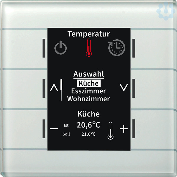 Glas Bedienzentrale Smart mit Farbdisplay, Weiß. Ausführung mit 6 Sensorflächen. Integrierter Busankoppler. Großes, aktives Farbdisplay (automatische Helligkeitsanpassung). Vier Direktbedienfunktionen (z. B. Anwesend, Licht, Jalousie). 20 Bedienfunktionen über Menü/Schaltuhr (z.B. Dimmen/Jalousie/Schalten/Werte senden/Szenen/Temperatursollwerte). Codeschloss mit 4-6 Ziffern zur Gerätesperrung oder Alarm-Scharfschaltung. Tages-/Wochen-/Astro-Zeitschaltuhr (20 Kanäle mit je 6 Schaltzeiten). Urlaubsfunktion mit Zeitraumaktivierung. Automatische Feiertagsberechnung. Komfortabler Raumtemperaturregler mit Temperatursensor. Lüftungssteuerung (Hand oder Automatik). Anzeige von Innen-/Außentemperatur, Sollwert und Uhrzeit/Datum. Anzeige von Statusinformationen / Meldungen(1Bit)/(14Byte). 6 Status LEDs unabhängig ansteuerbar. 6 Logikblöcke mit je 4 Eingängen. Keine zusätzliche Spannungsversorgung erforderlich. Einbau in Schalterdose, Abmessungen (B x H): 92mm x 92mm. Empfohlene Montagehöhe 1,6m. 3 Jahre Produktgaranti