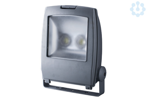 Bewährter, hochwertiger LED-Strahler mit Sicherheitsglas im Aluminiumdesign, strahlwassergeschützt, IP 65 mit 14500 Lumen Lichtleistung, Abstrahlwinkel 120°, Tageslicht, Gehäuse aluminiumfarben, Spannung 230V AC Leistung 100 W, mit Befestigungsbügel, komplett mit 5 m H07 RN-F und Stecker IP44