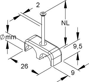 BI-TOP-Doppel-Nagelschelle, mit vormontiertem Nagel Ø 2 mm, halogenfrei. Abmessungen (ca. Maße) H x B x L : 9,5 x 9 x 26 mm für Kabel-Ø : 7 - 11 mm Anzahl der Leitungen : 2 Nagellänge NL : 35 mm Werkstoff : PE (Polyethylen) Werkstoff Nagel : Stahl, galvanisch verzinkt Farbton : lichtgrau RAL : 7035 (ähnlich)