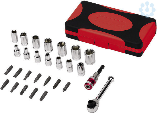 Bit- und Steckschlüsselsortiment, 28-teilig, in ansprechend kompakter zweifarbiger Kunststoffbox, Steckschlüssel und Antriebsratsche aus Chrom-Vanadium-Stahl, spezialgehärtet, hochglänzend poliert und hartverchromt, Inhalt: je 1 Stück, Zwölfkant-Steckschlüsseleinsätze mit 1/4 Zoll-Vierkantantrieb: 4 4, 5-5-5, 5-6-7-8-9-10-11-12-13-14mm, Mini-Ratsche mit Umschalter und Quick-Release- 1/4 Zoll-Vierkantantrieb, Schraubbits aus S2-Spezialstahl, 25 mm lang, je ein Bit, für Schlitzschrauben 4-5-6mm, für Kreuzschlitzschrauben PHILLIPS PH1-PH2-PH3, für Kreuzschlitzschrauben Pozidriv PZ1-PZ2-PZ3, für Innensechskant-(Innensechskant-)Schrauben 4-5-6mm, Bithalter mit Schnellverschluss, 55 mm lang, für Hand- und Maschinenbetrieb, Adapter von 1/4 Zoll-Vierkantantrieb (z. B. für Ratsche) zu 1/4 Zoll-Sechskantantrieb (z. B. für Schraubbits), 25 mm lang