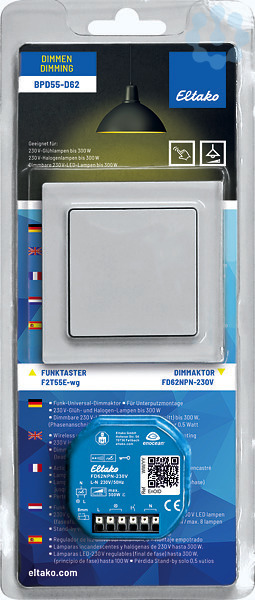 Blisterpack Dimmen mit Funktaster F2T55E-wg und Funk-Universal-Dimmaktor FD62NPN-230V. Smart Home Sensor und Smart Home Aktor. F2T55E-wg: Funk-2-Kanal-Taster im E-Design55, 80x80mm außen, Rahmen-Innenmaß 55x55mm, 15mm hoch. Erzeugt die Energie für Funktelegramme selbst bei Tastendruck, daher ohne Anschlussleitung und kein Stand-by-Verlust. Mit Wippe. Smart Home Sensor. Funktaster mit einer Wippe können zwei auswertbare Signale senden: Wippe oben drücken und Wippe unten drücken. Die Halteplatte kann auf eine ebene Fläche geschraubt oder mit der beiliegenden Klebefolie an die Wand, auf Glas oder auf Möbel geklebt werden. Über einer 55mm-Schalterdose werden die in der Dose vorhandenen Hülsen zur Schraubbefestigung verwendet. FD62NPN-230V: Funk-Universal-Dimmaktor. Mit Power MOSFET. 230V-Glüh- und Halogen-Lampen bis 300W, abhängig von den Lüftungsverhältnissen. Dimmbare 230V-LED-Lampen in der Betriebsart Phasenabschnitt bis 300W, bzw. in der Betriebsart Phasenanschnitt bis 100W, abhängig von den Lüftungsverhältn