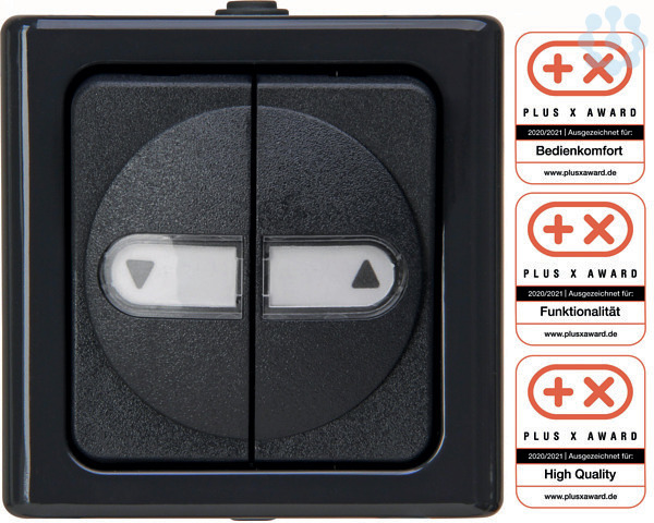 Aufputz-Feuchtraum, Jalousie-Taster im Design BLUE ELECTRIC, mit Umkehrsperre, elektrisch und mechanisch verriegelt, Betätigungswippen mit Pfeil-Symbol, Schaltvermögen 10AX, Nennspannung 250V~, Schutzart IP44, Farbe: anthrazit