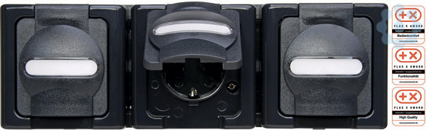 Aufputz-Feuchtraum, Schutzkontakt-Steckdose, 3-fach im Design BLUE ELECTRIC, fertig verdrahtet, alle Klappdeckel mit Beschriftungsfeld, waagerecht, Nennspannung 250V~, Nennstrom 16A, Schutzart IP44, Farbe: anthrazit