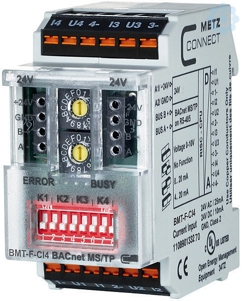 Das BACnet MS/TP-Modul mit 4 analogen Eingängen wurde für dezentrale Schaltaufgaben entwickelt. Es können Ströme und Spannungen, von z. B. aktiven Temperaturfühlern, elektrischen Lüftungs- und Mischklappen, Ventilsteuerungen usw., erfasst werden. Jeder Eingang kann per DIP-Schalterpaar auf der Frontseite entweder als Strom- oder Spannungseingang eingestellt werden. Mit einen BACnet-Client können die Eingänge über Standard-Objekte abgefragt werden. Die Einstellung der Moduladresse und der Bitrate erfolgt über zwei Drehschalter auf der Frontseite. Geeignet zur dezentralen Montage auf Tragschiene TH35 nach IEC 60715 in Elektroverteilern.Anschluss mit Federkraftklemmen (Push-In)