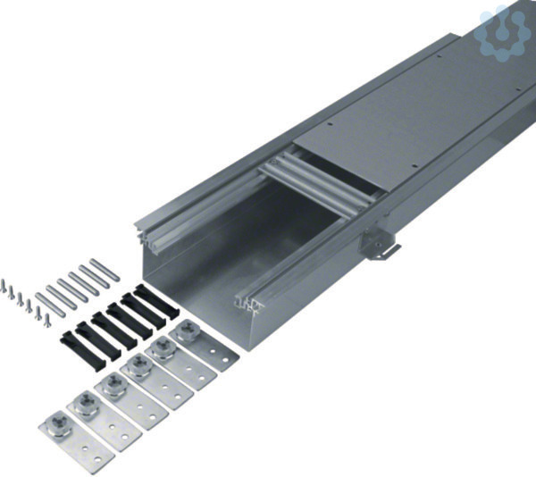 Bodenkanal estrichbündig mit Wanne aus Stahlblech BKW 200x(90-130)mm. Estrichbündiger Installationskanal nach DIN EN 50085-1 und DIN EN 50085-2-2, mit Bodenwanne, bestehend aus: Kanalseitenprofilen aus Aluminium, Traversen, Estrichankern, Bodenbelagsanlegeprofilen (0 oder 4 mm) aus Kunststoff, Nivellierschellen mit Kanalverbindern und Nivellierstiften, verschraubten Blinddeckeln, geeignet für trockengepflegte Böden, akustisch entkoppelt, werkseitig vormontiert.