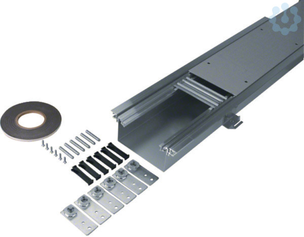 Bodenkanal estrichbündig mit Wanne/Dichtmöglichkeit Stahl BKWD 200x(70-110)mm. Estrichbündiger Installationskanal nach DIN EN 50085-1 und DIN EN 50085-2-2, mit Dichtungsmöglichkeit für Blinddeckel und Abdeckungen, mit Bodenwanne, bestehend aus: Kanalseitenprofilen aus Aluminium, Traversen, Estrichankern, Bodenbelagsanlegeprofilen (0 oder 4 mm) aus Kunststoff, Nivellierschellen mit Kanalverbindern und Nivellierstiften, verschraubten Blinddeckeln, geeignet für trockengepflegte Böden, akustisch entkoppelt, werkseitig vormontiert.