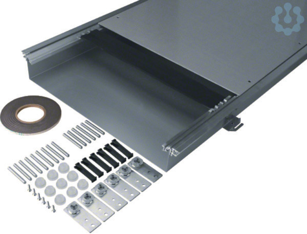 Bodenkanal estrichbündig mit Wanne/Dichtmöglichkeit Stahl BKWD 600x(80-120)mm. Estrichbündiger Installationskanal nach DIN EN 50085-1 und DIN EN 50085-2-2, mit Dichtungsmöglichkeit für Blinddeckel und Abdeckungen, mit Bodenwanne, bestehend aus: Kanalseitenprofilen aus Aluminium, Traversen, Estrichankern, Bodenbelagsanlegeprofilen (0 oder 4 mm) aus Kunststoff, Nivellierschellen mit Kanalverbindern und Nivellierstiften, verschraubten Blinddeckeln, geeignet für trockengepflegte Böden, akustisch entkoppelt, werkseitig vormontiert.