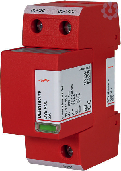 Einpoliger, koordinierter Blitzstromableiter DEHNsecure modular, Klassifikation Typ 1 nach EN 61643-11 auf Funkenstreckenbasis. Speziell für den Einsatz in DC-Stromkreisen geeignete Funkenstreckentechnologie. Zum Schutz von Gleichstrom-Verbraucheranlagen vor Überspannungen auch bei direkten Blitzeinschlägen. Zum Einsatz im Blitz-Schutzzonen-Konzept an den Schnittstellen 0A ? 1.