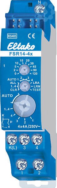 Stromstoß-Schaltrelais mit 4 Kanälen, je 1 Schließer 4A/250V AC, Glühlampen 1000W, potenzialgetrennt von der Versorgungsspannung, mit DX-Technologie. Bidirektional. Stand-by-Verlust nur 0,1 Watt. Anschluss an den Eltako-RS485-Bus. Querverdrahtung Bus und Stromversorgung mit Steckbrücke. Hierzu einfach den N-Leiter an die Klemme (N) und L an K(L) anschließen. Dadurch ergibt sich ein zusätzlicher Stand-by-Verlust von nur 0,1 Watt. Sind alle 4 Relais des FSR14-4x eingeschaltet, werden 0,7 Watt benötigt. Beim Ausfall der Versorgungsspannung wird definiert ausgeschaltet. Die Kanäle können unabhängig voneinander als ES- und/oder ER-Kanal eingelernt werden. Szenen-Steuerung: Mit einem der vier Steuersignale eines als Szenentaster eingelernten Tasters mit Doppelwippe können mehrere Kanäle eines oder mehrerer FSR14-4x zu je einer Szene ein- bzw. ausgeschaltet werden. Zentralbefehle am PC werden mit der Gebäudefunk-Visualisierungs- und Steuerungs-Software GFVS gesendet. Hierzu am PC einen oder mehrere FSR14-4x einlerne