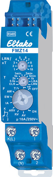 Multifunktions-Zeitrelais mit 10 Funktionen, 1 Wechsler potenzialfrei 10A/250V AC, Glühlampen 2000W , mit DX-Technologie. Bidirektional. Stand-by-Verlust nur 0,4 Watt. Reiheneinbaugerät für Montage auf Tragschiene. Anschluss an den Eltako-RS485-Bus. Querverdrahtung Bus und Stromversorgung mit Steckbrücke. Es können Funk-Fenster-Türkontakte (FTK) mit der Funktion Schließer oder Öffner bei geöffnetem Fenster eingelernt werden. Wird ein RIchtungstaster eingelernt, so kann mit der oberen Taste (START) eine Funktion (z.B. TI) gestartet und mit der unteren Taste (STOP) gestoppt werden. Hierzu einfach den N-Leiter an die Klemme (N) und L an K (L) anschließen. Dadurch ergibt sich ein zusätzlicher Stand-by-Verlust von nur 0,1 Watt. Beim Ausfall der Versorgungsspannung schalten beide Kontakte aus. Bei wiederkehrender Versorgungsspannung schließt Kontakt 1. Zeiten zwischen 0,5 Sekunden und 10 Stunden einstellbar. Mit dem oberen und dem mittleren Drehschalter wird eingelernt und anschließend die Zeit eingestellt. Die LED