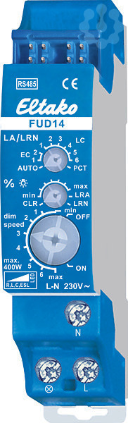 Universal-Dimmschalter, Power MOSFET bis 400W. Automatische Lampenerkennung. Bidirektional. Stand-by-Verlust nur 0,3 Watt. Mindesthelligkeit und Dimmgeschwindigkeit einstellbar. Mit Kinderzimmer-, Schlummer- und Lichtweckerschaltung. Zusätzlich mit Lichtszenensteuerung und Konstantlichtregelung. Reiheneinbaugerät für Montage auf Tragschiene. Universal-Dimmschalter für Lampen bis 400W, abhängig von den Lüftungsverhältnissen, dimmbare Energiesparlampen ESL und dimmbare 230V-LED-Lampen zusätzlich abhängig von der Lampenelektronik. Schaltung im Nulldurchgang mit Soft-Ein und Soft-Aus zur Lampenschonung. Schaltspannung 230V. Keine Mindestlast erforderlich. Die eingestellte Helligkeitsstufe bleibt beim Ausschalten gespeichert (Memory). Bei einem Stromausfall werden die Schaltstellung und die Helligkeitsstufe gespeichert und wird gegebenenfalls bei Wiederkehr der Versorgungsspannung eingeschaltet. Automatische elektronische Überlastsicherung und Übertemperatur-Abschaltung. Anschluss an den Eltako-RS485-Bus. Querverd