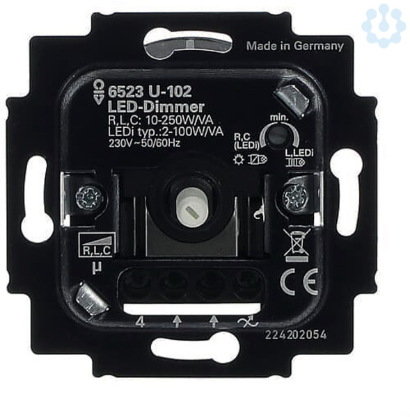 Mit Drehbetätigung, Druckfolgewechselschalter und Soft-Rastung. 2-Leiter-Anschlusstechnik (Neutralleiter nicht erforderlich). Optimiert für das Dimmen von Retrofit-LED-Leuchtmitteln (LEDi). Für dimmbare Retrofit-LED-Leuchtmittel (LEDi). Für dimmbare Retrofit-LED-Leuchtmittel (LEDi) an konventionellen oder elektronischen Transformatoren Für Glühlampen, 230 V-Halogenglühlampen, Niedervolt-Halogenlampen mit konventionellen oder elektronischen Transformatoren und dimmbare Halogen-Energiesparlampen. Mischlastbetrieb LEDi und herkömmliche Leuchtmittel möglich. Mittels Wahlschalter zwischen Phasenan- und Phasenabschnitt umschaltbar. Geräuscharm durch Einsatz von MOSFET-Transistoren. Kurzschlussfest und überlastsicher (elektronische Sicherung). Mit einstellbarer Minimalhelligkeit. Ohne Zentralscheibe. Nennspannung: 230 V~, + 10 % / - 10 % Nennfrequenz: 50 Hz/60 Hz Nennleistung: 2 - 100 W/VA (Retrofit-LED-Lasten). Nennleistung: 10 - 250 W/VA (Nicht-LED-Lasten). Beleuchtbar durch Glimmlampe. Glimmlampe im Lieferumfang