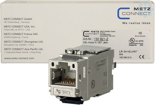 Modulare Cat.6, A Anschlusseinheit RJ45, Einbauform: Keystone, Kabelzuführung 180°, robustes, einteiliges und wieder verwendbares Modulgehäuse aus Zinkdruckguss, veredelt, Montage ohne Spezialwerkzeug, Zugentlastung per Rastclip direkt am Ladestück, Spezialwerkzeug-freie Migration auf 25G-Systeme, montagefreundlicher Anschluss von Datenleitungen AWG 26/1 - 22/1 (eindrähtig) und AWG 26/7 bis 22/7 (mehrdrähtig) an IDC-Schneidklemmen, intelligentes Kabelmanagement im Ladestück, auch für stark verdrillte Leitungen geeignet, Kennzeichnung der Adernbelegung T568A und T568B direkt auf dem Ladestück, GHMT Cat.6, A re-embedded PVP zertifiziert, Cat.6, A Komponentenprüfung nach ISO/IEC 11801 Ed.2.2:2011-06, DIN EN 50173-1:2011-09, TIA/EIA-568-C.2 (2009-08) und IEC 60603-7-51 Ed.1 (12/2008), GHMT zertifiziert, Einhaltung der Klasse E, A bis 500 MHz nach ISO/IEC 11801 Ed.2.2:2011-06, DIN EN 50173-1:2011-09, getestet: Komponente bis 600 MHz, Link bis 800 MHz, für 10GBit Ethernet (IEEE 802.3an), Remote Powering (PoE, PoE p