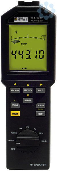In der Digital-Anzeige werden ein Bargraph mit 42 Segmenten, eingestellte Funktionen, Alarm-Grenzwerte usw. angezeigt. Auf die 7 Maßeinheiten (U/min, RPM, Hz usw.) kann direkt über den Drehschalter zugegriffen werden und jeder Taste ist genau eine Funktion zugeordnet (MIN MAX, Glättung, Warn-Grenzwerte usw.).