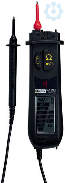 Beschreibung Der Spannungs- und Durchgangsprüfer C.A 745N zeigt auf seiner LCD-Anzeige die gemessene Spannung in Form eines Bargraph mit 7 Pegeln an. Das kompakte Gerät liegt gut in der Hand. Seine Prüfspitzen sind abnehmbar und einfach zu ersetzen, und sie lassen sich bequem in eine Aufnahme am Gehäuse einclipsen. Der C.A 745N prüft AC- und DC-Spannungen bis 690 V mit automatischer AC- und DC-Erkennung, Widerstandswerte werden in 3 Pegeln angezeigt und der Prüfer verfügt über akustische Durchgangsprüfung. Die Phasenprüfung erfolgt einpolig und der C.A 745N löst selbst hochempfindliche FI-Schutzschalter bei Phase/Erde-Prüfungen nicht aus. Die Batteriebetriebszeit beträgt 150 Stunden mit Alkali-Batterien.