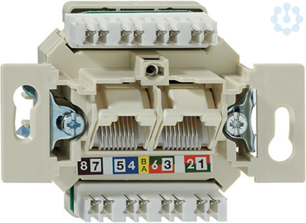 ClassEA iso U 2-fach-Steckdose, ungeschirmt, mit Spreizkrallen, - ClassEA iso U Dose, für den Einsatz in 10-Gigabit-Ethernet-Netzwerken (Übertragungsbandbreite 500 MHz), - Adernanschluss im eingebauten Zustand prüfbar, - schnelle Installation durch LSA-Kontakte, - RJ45-Stecköffnungen schräg nach unten geneigt, - Farbcode T568A und T568B gemäß TIA / EIA-568-B.2, - LSA-Klemmen für einen Leiter 0,4-0,63 mm Ï, AW 26-22, Wiederbelegbarkeit > 50-mal, - geeignet für PoE+ (Power over Ethernet)gemäß IEEE 802.3at, - UPOE-konform, - HDBaseT-konform, - Entsprechend nachfolgender Normanforderungen:, - ISO/IEC 11801 ClassEA, ungeschirmt, DIN EN 50173 ClassEA, ungeschirmt, - DIN EN 60 603-7-41, 500 MHz, ungeschirmt, TIA/EIA-568-C.2, ClassEA, ungeschirmt, - Lebenszyklen > 1000 Steckzyklen, - metrische Schrauben für Zentralstücke, - passend zu UAE-Designabdeckungen der Schalterindustrie (Berker, Busch-Jaeger, GIRA, Jung, Merten u.a.), - RJ11/12 fehlstecksicher