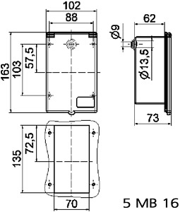 Sonstige technische Eigenschaften: Die Befestigung ist 103x88 und die Einbauöffnung 135x70, Die Leitungseinführung ist einmal rückwärtig offen, Der Gerätestecker im Gehäuse ist ausschwenkbar