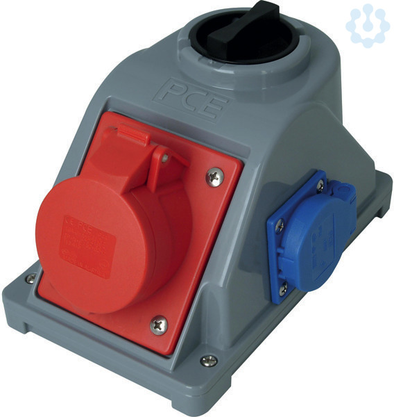 CEE-Kombi-Wandsteckdose, CEE-Steckdose,Schutzkontakt-Steckdose mit Klappdeckel, mit Schalter für Schutzkontakt-Steckdose, 16A, 250V~, Schutzart IP44,5-polig, 16A, 400V~, 6h