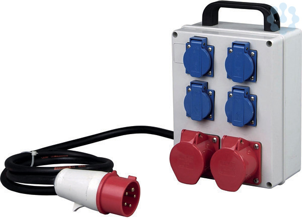 CEE-Kunststoff-Mobilverteiler mit Tragegriff, Eingang: CEE-Stecker, 5-polig, 16A, 400V~, 6h Ausgang:2x CEE-Steckdosen, 5-polig, 16A, 400V~, 6h und 4x Schutzkontakt-Steckdosen, 16A, 250V~Leitung: 2m, 07RN-F 5x2,5mm²Schutzart IP44