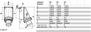 63A 3p (2P+PE) 400V (380 bis 415V) 9h IP67, Frequenz: 50 und 60Hz, Technische Kennfarbe: rot RAL 3000, Gehäusegröße: 170x118 mm (HxB), Kontaktträger/Kontakte: Der Kontaktträger ist aus hochwarmebeständigem Material, Die Kontakte sind Messing vernickelt, Maximaler Leiterquerschnitt: 16,0 qmm, Gehäusematerial: Polycarbonat, Anschlusstechnik: Schraubklemmen als Rahmenklemmen, Kabeleinführung: 1xM40 oben, 2xM32 unten, Gerätefarbe: Kragen rot RAL 3000, Bajonettring grau RAL 7035, Gehäuseunterteil grau RAL 7035, Gehäuseoberteil grau RAL 7035, Gerätehöhe: 259 mm, Gerätebreite: 118 mm, Gerätetiefe: 174 mm, Sonstige technische Eigenschaften: Die Leitungseinführung ist einmal oben offen und zweimal unten verschlossen, Das Gehäuseunterteil ist um 180° drehbar