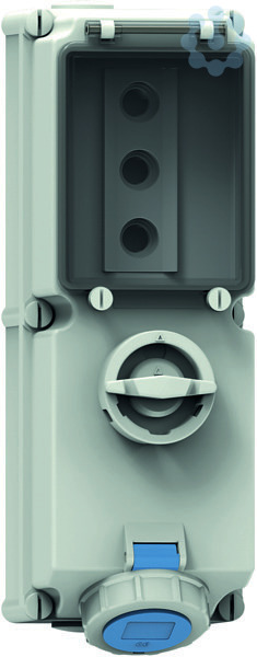 Gerätefarbe: Betätigungsklappe rauchtopas, Klappdeckel blau RAL 5015, Bajonettring grau RAL 7035, Gehäuseschrauben grau RAL 7035, Gehäuseunterteil grau RAL 7035, Gehäuseoberteil grau RAL 7035, Schalterknebel grau RAL 7035,