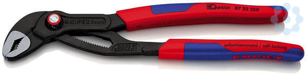87 22 250 KNIPEX Cobra® QuickSet Ganz öffnen, zuschieben, zupacken!. Zusätzliche Schnelleinstellung an das Werkstück durch Zuschieben. Verbindet das bewährte, sichere Einrasten des Gelenkbolzens mit einer zusätzlichen Schiebefunktion, die das Arbeiten in sehr engen und unzugänglichen Arbeitsbereichen erleichtert. Die Einstellung direkt an das Werkstück kann durch einfaches Zuschieben erfolgen. Sicheres Einrasten des Gelenkbolzens bei der ersten Belastung. Danach ist die Griffweite der Zange fixiert und kann nur noch durch Drücken des Knopfes verstellt werden. Um die Schiebefunktion erneut zu aktivieren, wird der Gelenkbolzen per Knopfdruck ausgedrückt und die Zange einmal ganz geöffnet. - Einstellpositionen: 25 - Kapazität für Rohre Zoll (Durchmesser): Ø 2 - Kapazität für Muttern, Schlüsselweite (mm): 46mm - Kapazität für Rohre (Durchmesser): Ø 50mm