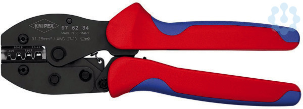 97 52 34 SB KNIPEX PreciForce® Gleichbleibend hohe Crimpqualität durch Präzisionseinsätze und Zwangssperre (entriegelbar). Crimpdruck ist werkseitig präzise eingestellt (kalibriert). Kraftverstärkung durch Kniehebel für ermüdungsarmes Arbeiten. Gutes Handling durch günstige Griffstellung, geringes Gewicht, kurze Bauform und ergonomisch geformte Griffe. SB-Karte/Blister. - Anwendung: unisolierte, offene Steckverbinder (2,8 + 4,8 mm Steckerbreite) - Kapazität Quadratmillimeter: 0,1???2,5mm² - Anzahl der Nester: 4 - AWG: 26???14