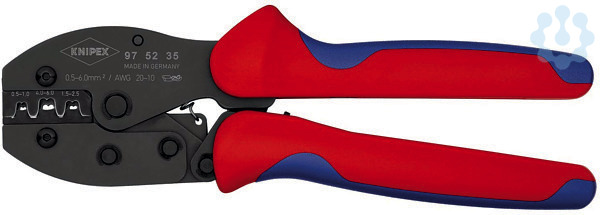 97 52 35 KNIPEX PreciForce® Gleichbleibend hohe Crimpqualität durch Präzisionseinsätze und Zwangssperre (entriegelbar). Crimpdruck ist werkseitig präzise eingestellt (kalibriert). Kraftverstärkung durch Kniehebel für ermüdungsarmes Arbeiten. Gutes Handling durch günstige Griffstellung, geringes Gewicht, kurze Bauform und ergonomisch geformte Griffe. - Anwendung: unisolierte, offene Steckverbinder (4,8 + 6,3 mm Steckerbreite) - Kapazität Quadratmillimeter: 0,5???6,0mm² - Anzahl der Nester: 3 - AWG: 20???10