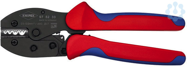 97 52 33 KNIPEX PreciForce® Gleichbleibend hohe Crimpqualität durch Präzisionseinsätze und Zwangssperre (entriegelbar). Crimpdruck ist werkseitig präzise eingestellt (kalibriert). Kraftverstärkung durch Kniehebel für ermüdungsarmes Arbeiten. Gutes Handling durch günstige Griffstellung, geringes Gewicht, kurze Bauform und ergonomisch geformte Griffe. - Anwendung: unisolierte Quetsch-, Rohr- und Presskabelschuhe nach DIN 46234 und DIN 46235 sowie unisolierte Quetsch-, Stoß- und Pressverbinder nach DIN 46341 und DIN 46267 - Kapazität Quadratmillimeter: 0,5???10,0mm² - Anzahl der Nester: 4 - AWG: 20???8