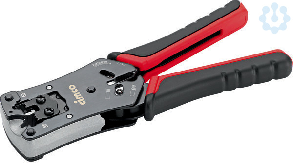 Crimpzange für ungeschirmte Modularstecker (Westernstecker) 4-, 6- und 8-polig, Ratschenautomatik mit stellbarer Sperrvorrichtung, Abschneid- und Abisoliereinrichtung, 2-Komponenten-Griffe, für RJ 10(4P2C und 4P4C), RJ 11 (6P4C), RJ 12 (6P6C), DEC (6P4C und 6P6C), RJ 45 (8P8C)