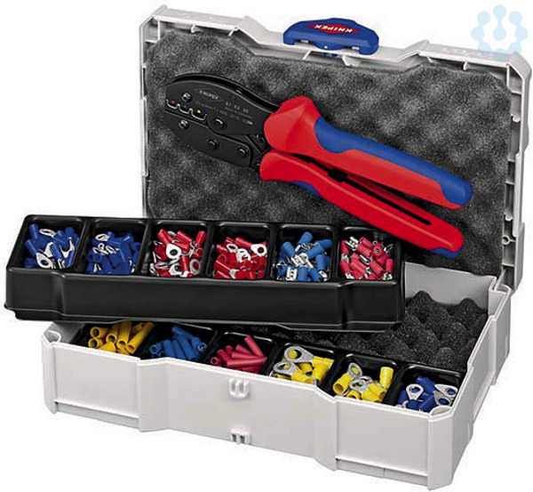 97 90 21 Crimp-Sortiment Im TANOS MINI-systainer® (stabile Kunststoffbox). T-Loc-Verschluss für Einhandbedienung: mit einem Dreh den systainer® öffnen oder schließen und mit einem zweiten systainer® verbinden.. Öffnen im verknüpften Zustand: Einfach und schnell auf die Inhalte zugreifen, ohne die Verbindung zu lösen.. Zwei stapelbare Kunststoffeinsätze mit je sechs Mulden für Verbinder. Mit einem Sortiment gebräuchlicher Kabelverbinder. mit Crimpzange KNIPEX PreciForce® 97 52 36 (für isolierte Kabelschuhe und Verbinder). systainer® ist ein eingetragenes Warenzeichen der TANOS GmbH. Lieferumfang: 1 x 97 52 36 KNIPEX PreciForce® Crimpzange (0,5 ? 6,0 mm²), 25 x KNIPEX Stoßverbinder, isoliert gelb (25 x 4,0-6,0 mm²), 25 x KNIPEX Stoßverbinder, isoliert blau (25 x 1,5-2,5 mm²), 25 x KNIPEX Stoßverbinder, isoliert rot (25 x 0,5-1 mm²), 25 x KNIPEX Kabelschuhe, Ringform Ø 8 mm (25 x 4,0-6,0 mm²), 25 x KNIPEX Kabelschuhe, Ringform Ø 6 mm (25 x 1,5-2,5 mm²), 25 x KNIPEX Kabelschuhe, Ringform Ø 5 mm (25 x 1,5-2,