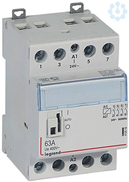 Legrand Installationsschütz CX3, Spulenspannung AC 24 V, 4-polig, Ausführung: 4 Schließer, Bemessungsbetriebsstrom Ie 63 A/ 400 VAC, mit Handschalter. Nach EN 61095, Gebrauchskategorie AC-1/AC-7a und AC-3/AC-7b, Installationsschütze zum Schalten von Lasten wie z.B. Lampengruppen, Motoren und Heizungen, mit Beschriftungsfenster, mit Schaltzustandsanzeige, Befestigung auf Hutprofilschiene EN 60715 durch rastende Schnellbefestigung, Anbau von Hilfsschaltern möglich.