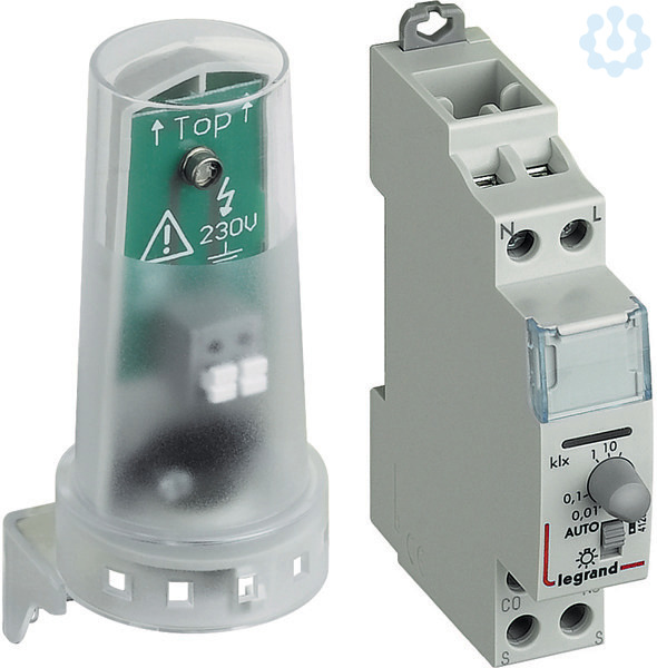 Legrand LuxoSwitch, 1-modulig, Dämmerungsschalter inkl. Lichtfänger 412860 ,1 Kanal, Betriebsspannung 230 V 50/60 Hz, Einstellbereich 1 - 100.000 Lux, Ein- und Ausschaltverzögerung ca. 90 Sek. , Handschalter Ein-Automatik, mit Beschriftungsfenster, Nulldurchgangsschaltung. Schaltausgang: 1 Schließer.