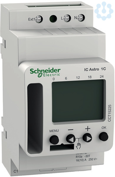 Programmierbarer Dämmerungsschalter zum Ein-/Ausschalten von elektrischen Verbrauchern (wie z.B. Beleuchtungsanlagen) anhand der Sonnen-auf- und Sonnenuntergangszeiten ohne Einsatz eines Lichtsensors. Die Sonnenauf- /Sonnenuntergangszeiten werden vom IC Astro automatisch auf Grundlage der geografischen Daten berechnet. Die Programmierung erfolgt am Gerät oder über die Smartphone App Acti 9 Light and Time Switch via Bluetooth Stick. Der Bluetooth Stick wird auch als Speicherkarte verwendet. Programmierbar auch über PC mittels Programmierkit CCT15860. Externer Eingang als Nebenstelle pro Kanal. Einstellbarer Schwellwert von 1-99.000 Lux. Kurzanleitung im Aufbewahrungsfach. Für die Montage auf Hutschienen TH35. nach EN 60715. Funktionen -84 Speicherplätze. Darstellung Astrozeiten für den aktuellen Tag. Darstellung des Schaltverhaltens in einem frei wählbaren Zeitraum. Offset Eingabe abweichender Sonnen-auf-/Sonnenuntergangs-zeiten (+/- 120 Minuten. 3 Astromodi Abends Ein, morgens Aus. Abends Aus, morgens Ein. In