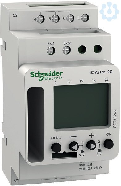 Programmierbarer Dämmerungsschalter zum Ein-/Ausschalten von elektrischen Verbrauchern (wie z.B. Beleuchtungsanlagen) anhand der Sonnen-auf- und Sonnenuntergangszeiten ohne Einsatz eines Lichtsensors. Die Sonnenauf- /Sonnenuntergangszeiten werden vom IC Astro automatisch auf Grundlage der geografischen Daten berechnet. Die Programmierung erfolgt am Gerät oder über die Smartphone App Acti 9 Light and Time Switch via Bluetooth Stick. Der Bluetooth Stick wird auch als Speicherkarte verwendet. Programmierbar auch über PC mittels Programmierkit CCT15860. Externer Eingang als Nebenstelle pro Kanal. Einstellbarer Schwellwert von 1-99.000 Lux. Kurzanleitung im Aufbewahrungsfach. Für die Montage auf Hutschienen TH35. nach EN 60715. Funktionen -84 Speicherplätze. Darstellung Astrozeiten für den aktuellen Tag. Darstellung des Schaltverhaltens in einem frei wählbaren Zeitraum. Offset Eingabe abweichender Sonnen-auf-/Sonnenuntergangs-zeiten (+/- 120 Minuten. 3 Astromodi Abends Ein, morgens Aus. Abends Aus, morgens Ein. In