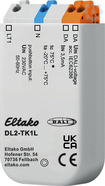 Kompaktes DALI-2 Steuermodul mit 2 Schalteingängen. Für Einbaumontage. 59mm lang, 33mm breit, 15mm tief. Schutzart: IP 20. DALI-Stromaufnahme 4,6mA. DALI-2 zertifiziert. DALI2 ist die neuste Generation des DALI-Standard mit erweitertem Funktionsumfang. DALI2-Geräte beherrschen auch alle bisherigen DALI-Funktionen und sind somit abwärtskompatibel. Kompaktes DALI-2 Steuermodul mit 2 Schalteingängen für 230V AC. Das DL2-TK1L wird vom DALI-Bus versorgt, es ist keine separate Versorgung erforderlich. Der Anschluss an die DALI-Klemmen ist polaritätsunabhängig. Galvanische Trennung zwischen Schalteingang und DALI-Interface. Multimasterfähig, mehrere Module können auf derselben DALI-Linie installiert werden. Integrierter DALI-2 Application Controller. Jedem Eingang können individuelle DALI-Befehle, Wirkbereich und Schaltfunktionen zugeordnet werden. Der Application Controller ermöglicht neben den Standard DALI Befehlen auch DALI DT8: Tunable White und RGB(W) Steuerung sowie Macros. Das Modul besitzt eine DALI-2 Inst