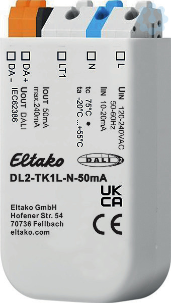 Kompaktes DALI-2 Steuermodul mit 2 Schalteingängen. Für Einbaumontage. 59mm lang, 33mm breit, 15mm tief. Schutzart: IP 20. DALI-2 zertifiziert. DALI2 ist die neuste Generation des DALI-Standard mit erweitertem Funktionsumfang. DALI2-Geräte beherrschen auch alle bisherigen DALI-Funktionen und sind somit abwärtskompatibel. Kompaktes DALI-2 Steuermodul mit 2 Schalteingängen für 230V AC. Mit integrierter DALI Busversorgung (50mA), eine zusätzliche Busversorgung darf nicht angeschlossen werden. Galvanische Trennung zwischen Schalteingang und DALI-Interface. Multimasterfähig, mehrere Module können auf derselben DALI-Linie installiert werden. Integrierter DALI-2 Application Controller. Jedem Eingang können individuelle DALI-Befehle, Wirkbereich und Schaltfunktionen zugeordnet werden. Der Application Controller ermöglicht neben den Standard DALI Befehlen auch DALI DT8: Tunable White und White RGB(W) Steuerung sowie Macros. Das Modul besitzt eine DALI-2 Instanz zur einfachen Integration. Unterstützt kurzen Tastendruck