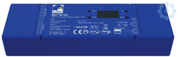 DALI-2-DT8-Dimmer, 4-Kanal-PWM-Ausgang, integrierte DALI-Master-Funktion Dank OLED-Display-Oberfläche ist eine einfache und schnelle Installation möglich Alle DT8-Farbtypen in einem Gerät: XY, Tc, RGBW, Push-Dim kompatibel für einfarbige Beleuchtung Jedes Gerät wird über eine einzige DALI-Adresse angesteuert 16 Szenen können vorab am Gerät definiert und abgerufen werden 250 Hz - 30 kHz PWM-Frequenz einstellbar, sanfte und feine DT8-Farbsteuerung Am Gerät kann direkt ein Dimmwert und eine manuelle Farbkontrolle vorgenommen werden (Stand-Alone Funktion) Einschalt-, Dimm- und Fehlerverhalten direkt am Gerät einstellbar Kompatibel mit universellen DALI-Mastern, die DT8-Befehle unterstützen Entspricht der IEC 62386-209: 2011 Für die Innenanwendung, IP20 Gerätetyp: DT8 Schutzklasse III, CE, RoHS, REACH Temperaturbereich: -20°C bis +50°C Eingangsspannung 12V DC - 24V DC Ausgangsspannung: 12V DC - 24V DC (PWM) Leistung: 4 x 60W (12V), 4x 120W (24V) LxBxH in mm: 170 x 53,5 x 28,8