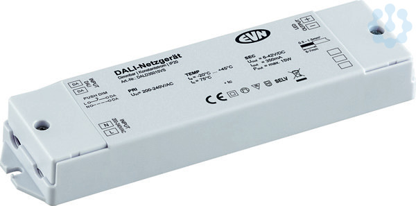 DALI-Dimmer-Empfänger mit integriertem Netzgerät fuer Unicolor-Leuchten mit automatischer DALI Adressen Einstellung. Ein Zusätzliches Betriebsgerät ist nicht erforderlich, da der Empfänger gleichzeitig als solches fungiert. Optional ist der Empfänger auch ueber Push-L (als 1-Kanal) dimmbar. Anschluesse: 1x Eingang fuer DALI-Bus oder Push-L, 1x Eingang fuer 200-240V/AC und 1x Ausgang fuer 350mA. Die Schraubklemmen sind fuer Kabel von 0,5mm². - 1,5mm². geeignet. Technische Daten: ta: -20°.C - 50°.C, tc: 75°.C, Leistung: 2,1-15W, Powerfaktor: 0,95.