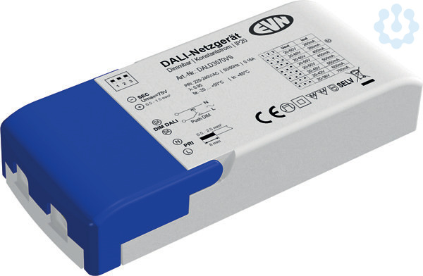 DALI-Dimmer-Empfänger mit integriertem Netzgerät fuer Unicolor-Leuchten mit automatischer DALI Adressen Einstellung. Ein Zusätzliches Betriebsgerät ist nicht erforderlich, da der Empfänger gleichzeitig als solches fungiert. Optional ist der Empfänger auch ueber Push-L (als 1-Kanal) dimmbar. Anschluesse: 1x Eingang fuer DALI-Bus oder Push-L, 1x Eingang fuer 200-240V/AC und 1x Ausgang fuer 260mA-700mA. Die Schraubklemmen sind fuer Kabel von 0,5mm². - 2,5mm². primär und von 0,5mm². - 1,5mm². sekundär geeignet. Technische Daten: ta: -20°.C - 50°.C, tc: 85°.C, Powerfaktor: 0,95. Der zu verwendendete Ausgangsstrom kann mittels Dipschalter eingestellt werden, hierbei sind folgende Einstellungen mit jeweiliger Leistung möglich: 260mA (5,2-15,6W), 350mA (7-21W), 400mA (8-24W), 450mA (9-24,8W), 500mA (10-25W), 550mA (11-24,8W), 600mA (12-25,2W), 700mA (14-25,2W). Protokoll: DT6, DALI2.