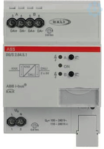 Zur Steuerung von DALI-Geräten über den ABB i-bus KNX. Ein/Zwei DALI-Ausgang/Ausgänge für bis zu 64/2x64 DALI-Slaves. DALI Netzteil ist integriert. Die Steuerung und Statusrückmeldung erfolgt über KNX pro DALI-Slave (64/2x64), mit Leuchtengruppen (16/2x16), gemeinsam im Broadcast oder pro Szene (16/2x16). DALI-Geräte vom Typ DT2 (autarker Notlichtkonverter nach EN 62386-202) und Typ DT8 (Farbtemperatur Tc/Tunable White nach EN 62386-209) werden unterstützt. Es stehen umfangreiche Fehler- und Fehlermeldungen zur Verfügung. Mit Hilfe von KNX und