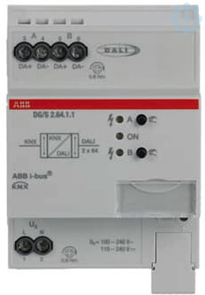 Zum Ansteuern von DALI-Teilnehmer über ABB i-bus®. Zwei DALI Ausgang für max. 2x64 DALI Teilnehmer. Die DALI Spannungsversorgung ist integriert. Die Ansteuerung erfolgt pro DALI Teilnehmer (2x64), über Gruppen (2x16), gemeinsam im Broadcast oder über Szenen (2x16). Umfangreiche Fehler- und Störmeldungen stehen zur Verfügung. DALI Notlichtkonverter (2x64) nach EN 62386-202 werden unterstützt. Über den Notlichtkonverter kann der Funktionstest und -Dauertests über KNX getriggert und das Ergebnis auf dem KNX zur Verfügung gestellt werden. Slave-, Treppenlicht-, Sperren- und Zwangsführung- Funktion sind integriert. Die DALI Telegrammrate ist veränderbar. Für eine individuelle Umadressierung der DALI-Teilnehmer oder Gruppenzuordnung steht ein separates Diagnose- und Inbetriebnahme-Tool, i-bus Tool zur Verfügung.