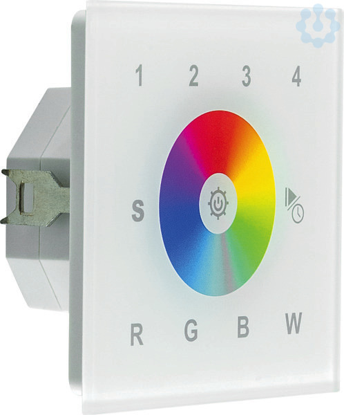 Mit dem DALI-Wandpanel können bis zu vier Kanäle angesteuert werden. Da es sich um ein RGBW-Wandpanel handelt, sind je Kanal vier DALI Adressen nötig. Die unterschiedlichen Farben können ueber das Touch-Wheel eingestellt werden, ebenso können die Farben Rot, Gruen, Blau und Weiß aber auch einzeln zu- und abgeschaltet werden. Zusätzlich zu den zehn gespeicherten Farbwechsel-Programmen ist es möglich je Kanal bis zu vier Lichtszenen zu speichern. Natuerlich ist auch das Dimmen mit dem Panel möglich. Da das Wandpanel als BUS-Geber fungiert ist der Einsatz der DALI Basisstation optional möglich, jedoch nicht zwingend nötig. Bei Betrieb als BUS-Geber (ohne DALI Basistation) erfolgt der Anschluss an 230V, wobei maximal 50 Teilnehmer ueber ein Wandpanel gesteuert werden können. Außerdem können 3 weitere Wandpanel in das System mit eingebunden werden, welche ueber die BUS-Spannung des ersten Wandpanel (BUS-Geber) betrieben werden. Bei Betrieb mit der DALI Basisstaion können max. 4 Wandpanel je Basisstation eingesetzt