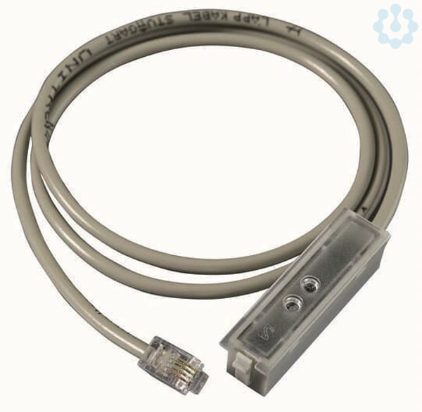 Datensensor (OKK: Optischer Kommunikationskopf), passend zu den Zählern ZE287, ZE295, ZE297, mit Leitung zum Einsetzen in die BKE zur Verbindung der Datenschnittstelle des eHZ mit Kommunikationsgeräten. Bei Leitungslänge über 500 mm (ZE210 und ZE215) ist das Verhältnis Datensensor zu eHZ 1:1, Übertragungsrate 921,6 kBit/s, Stecker RJ12-6P6C, Leitungslänge 500 mm.